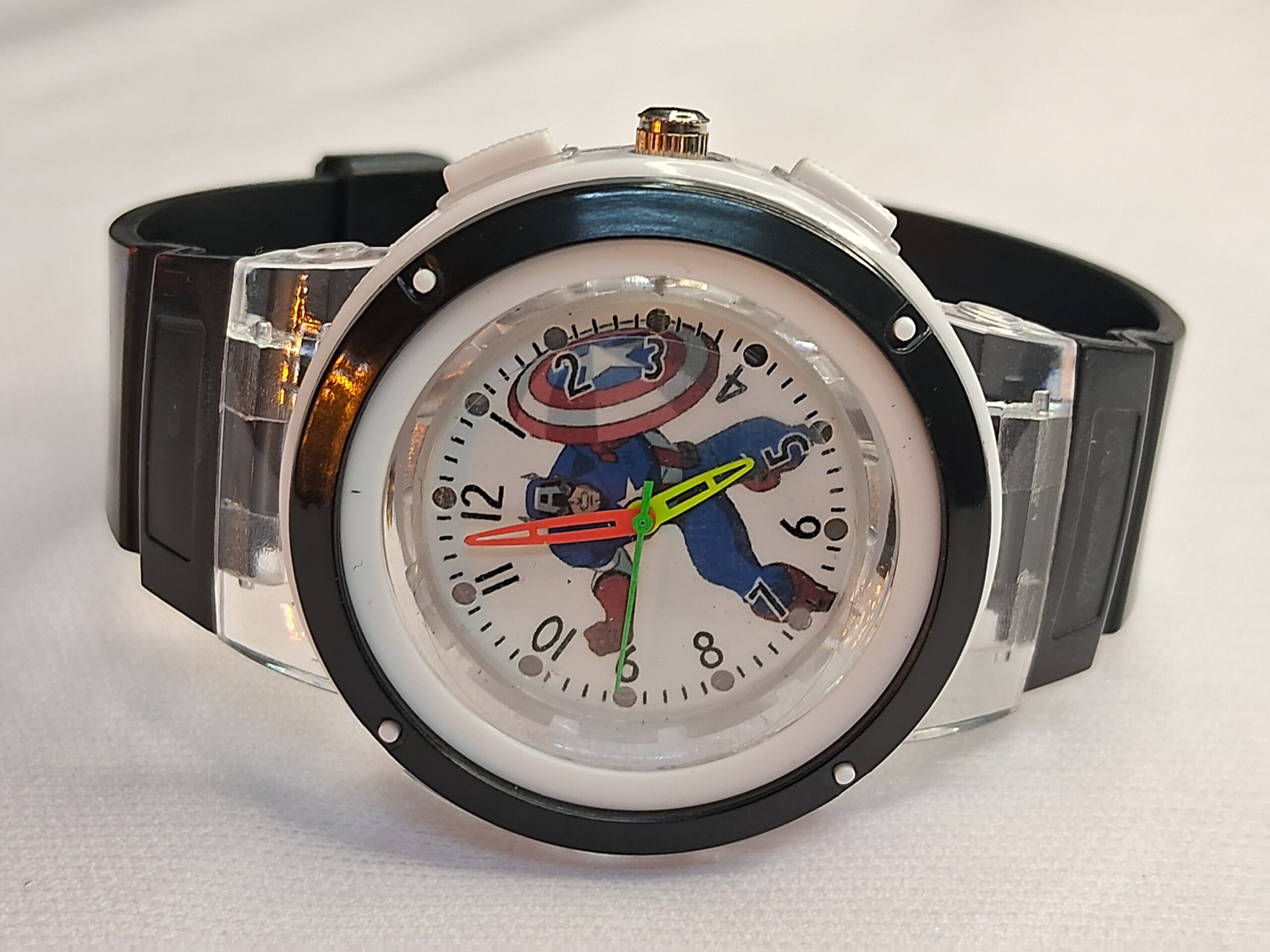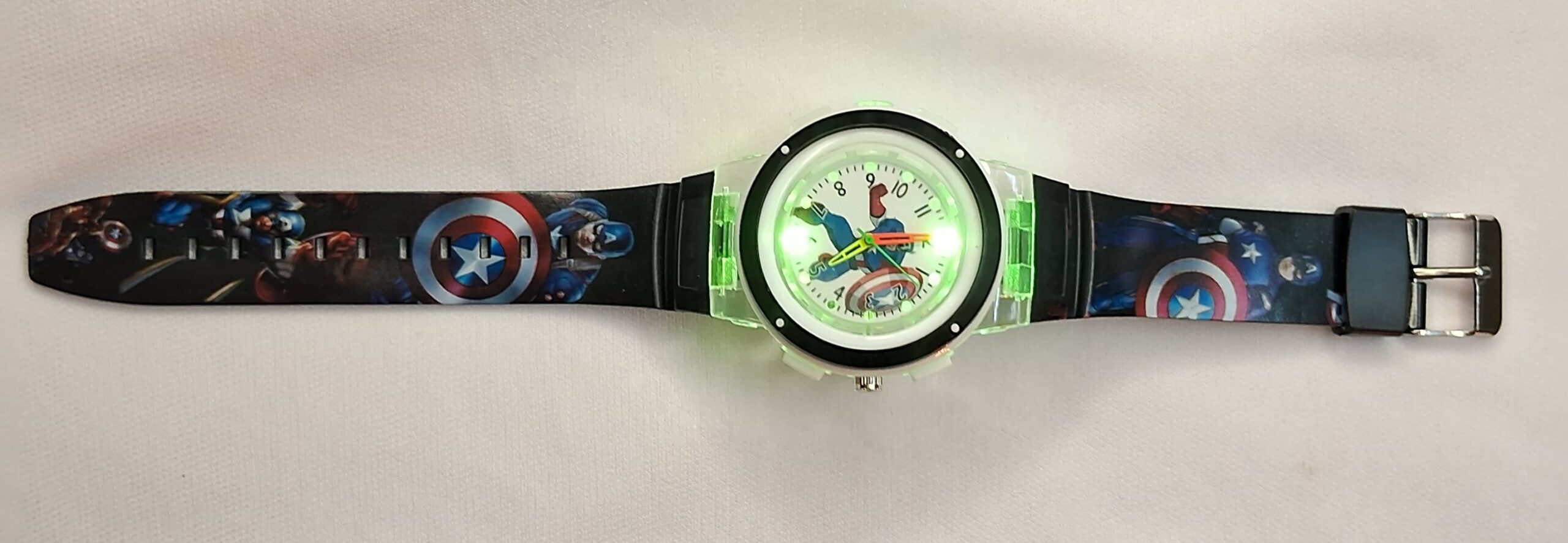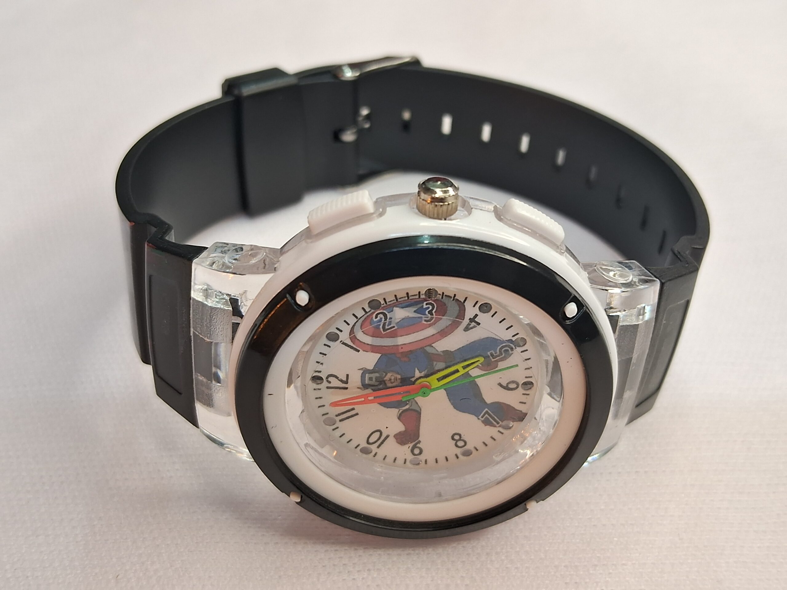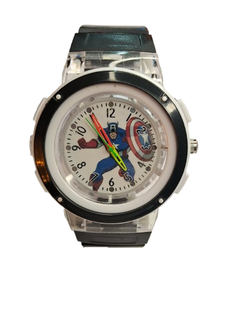 Product Title – Analog Wrist Watch for Kids | Round White Black Dial Luminous Captain America Printed Black Color Rubber Strap with Multicolor Light Blinking