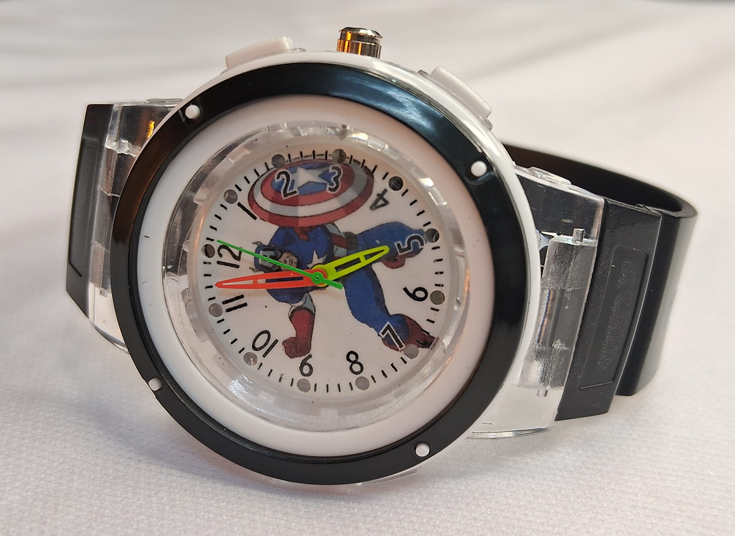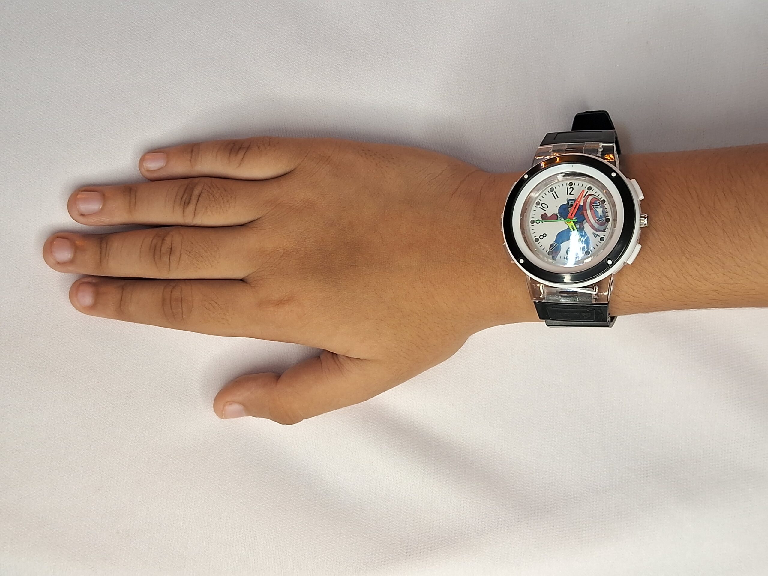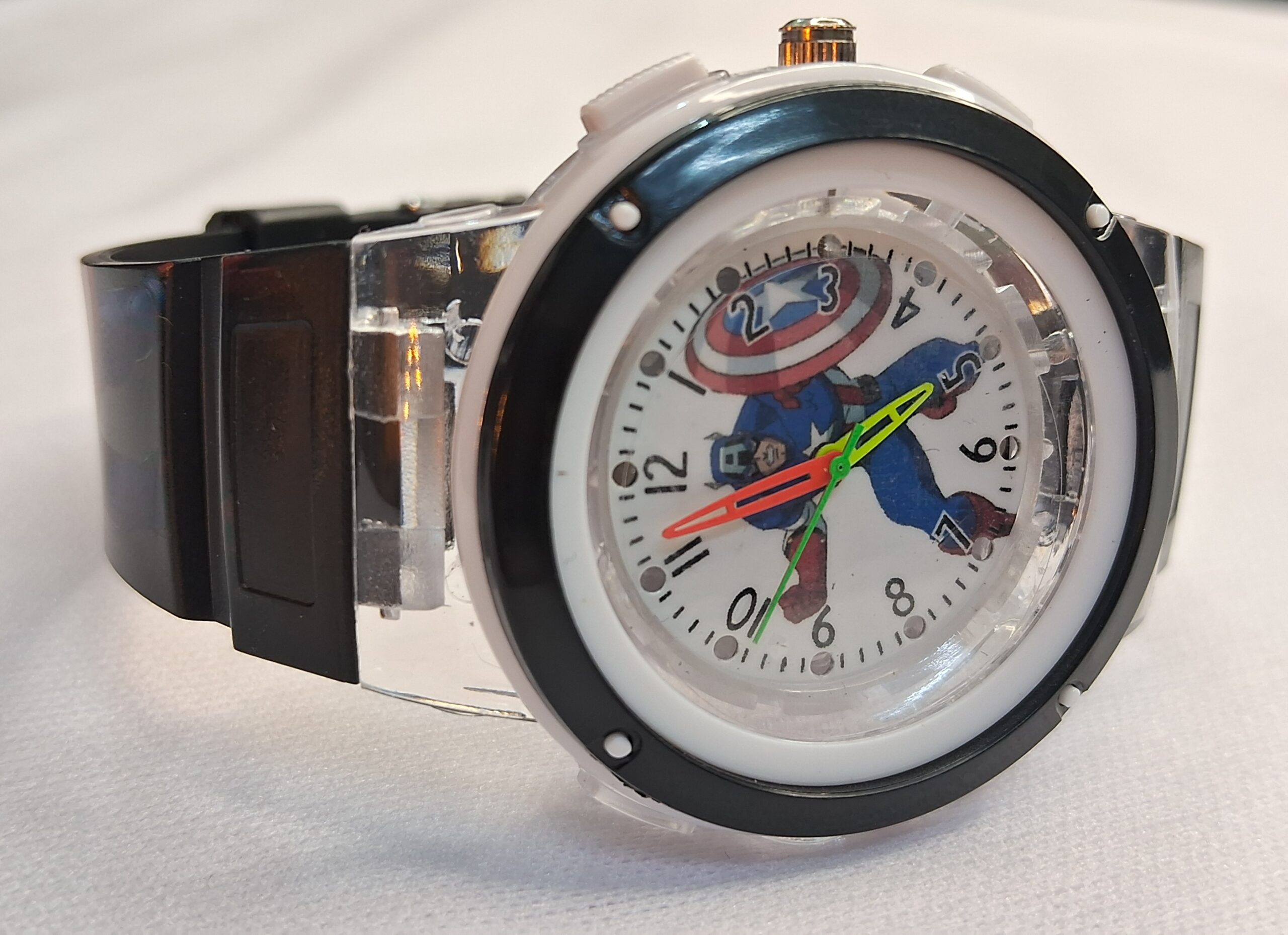 Product Title – Analog Wrist Watch for Kids | Round White Black Dial Luminous Captain America Printed Black Color Rubber Strap with Multicolor Light Blinking