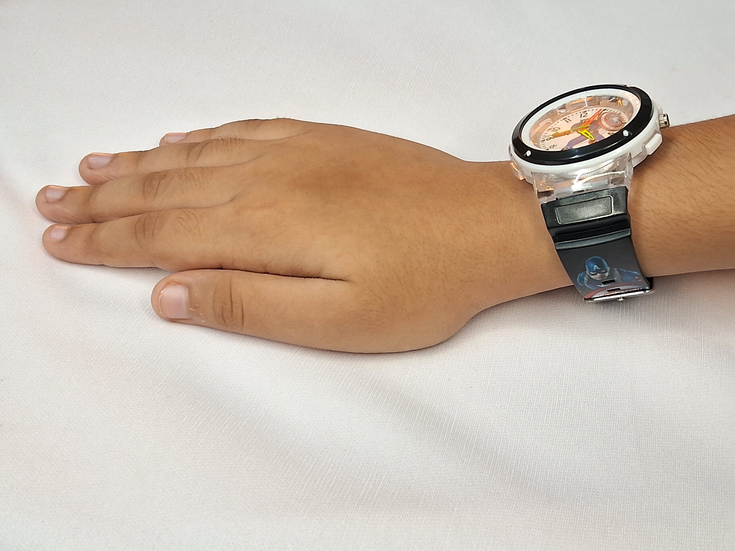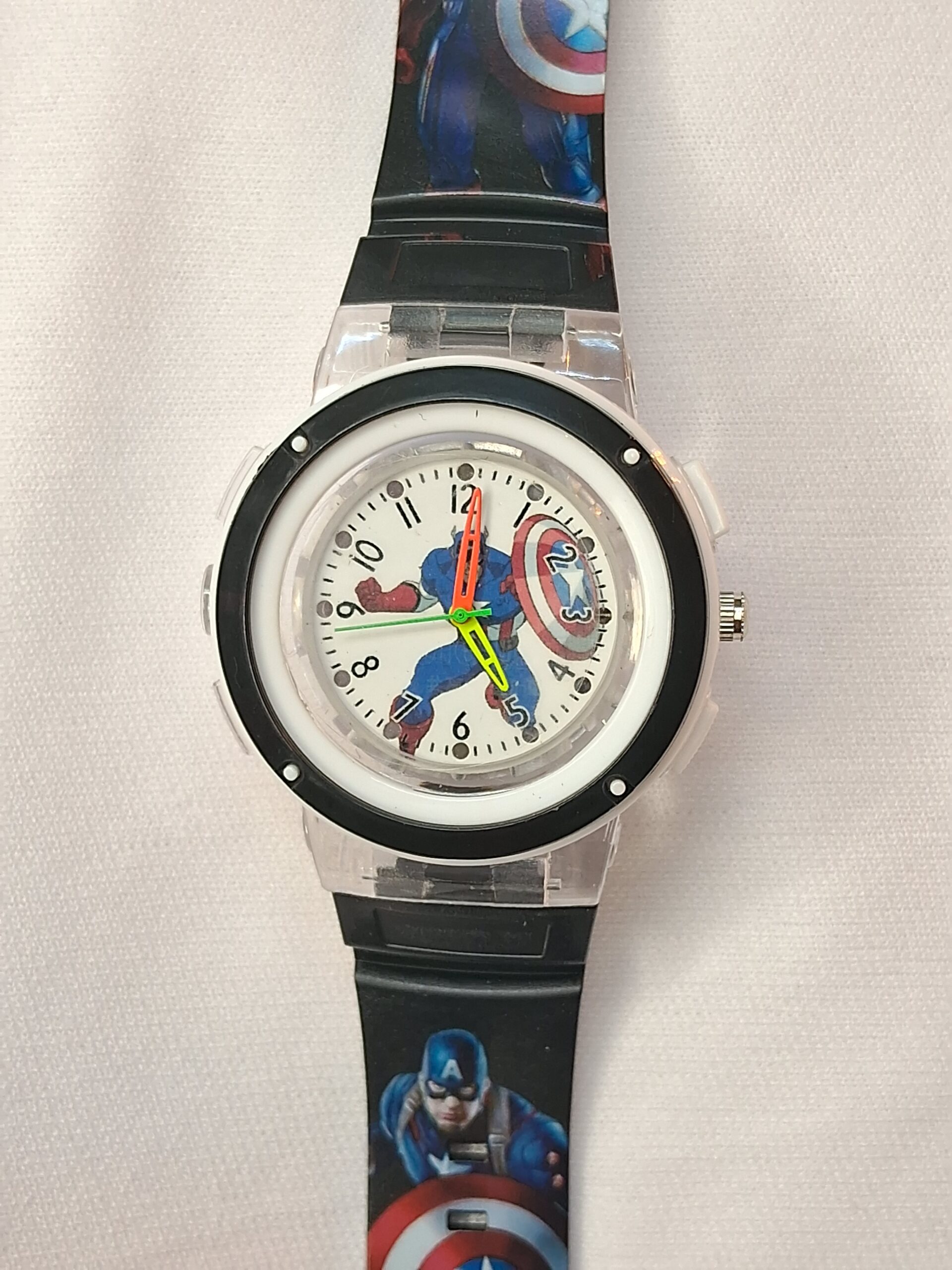 2. Round White Dial and Luminous Captain America print. Designed with bright colors and an easy-to-read display, this watch makes learning to tell time exciting.