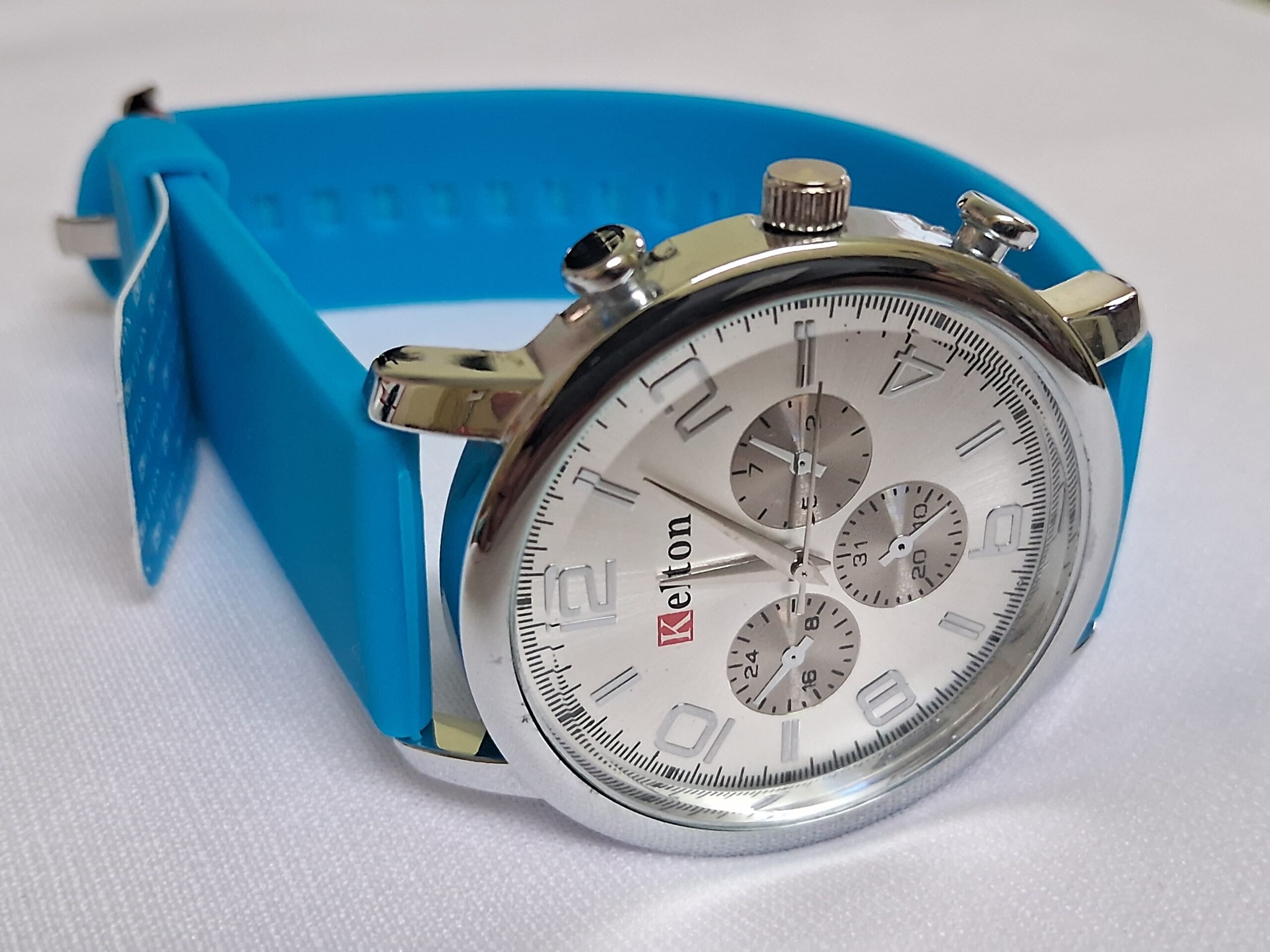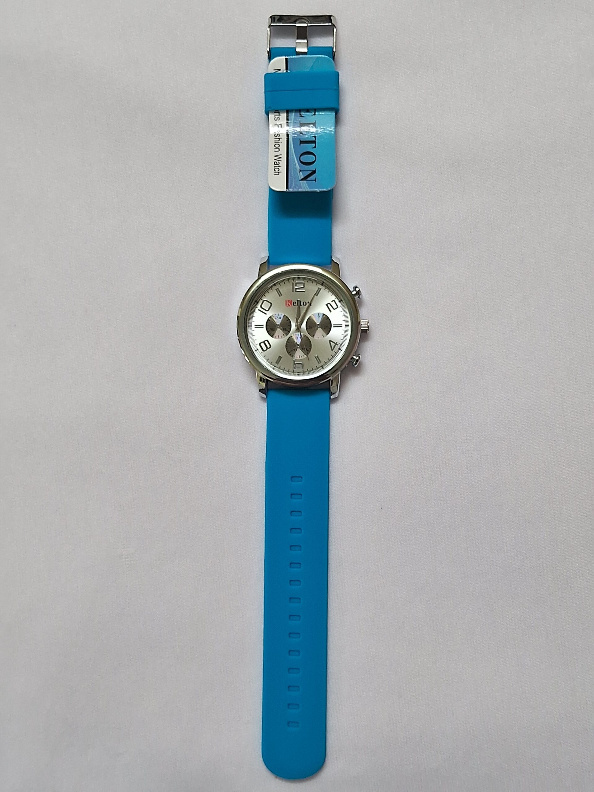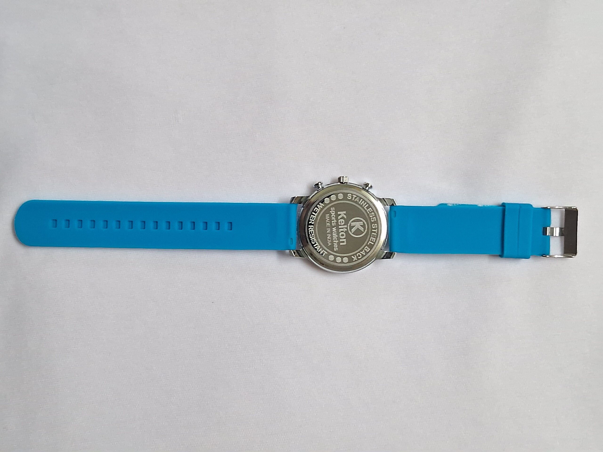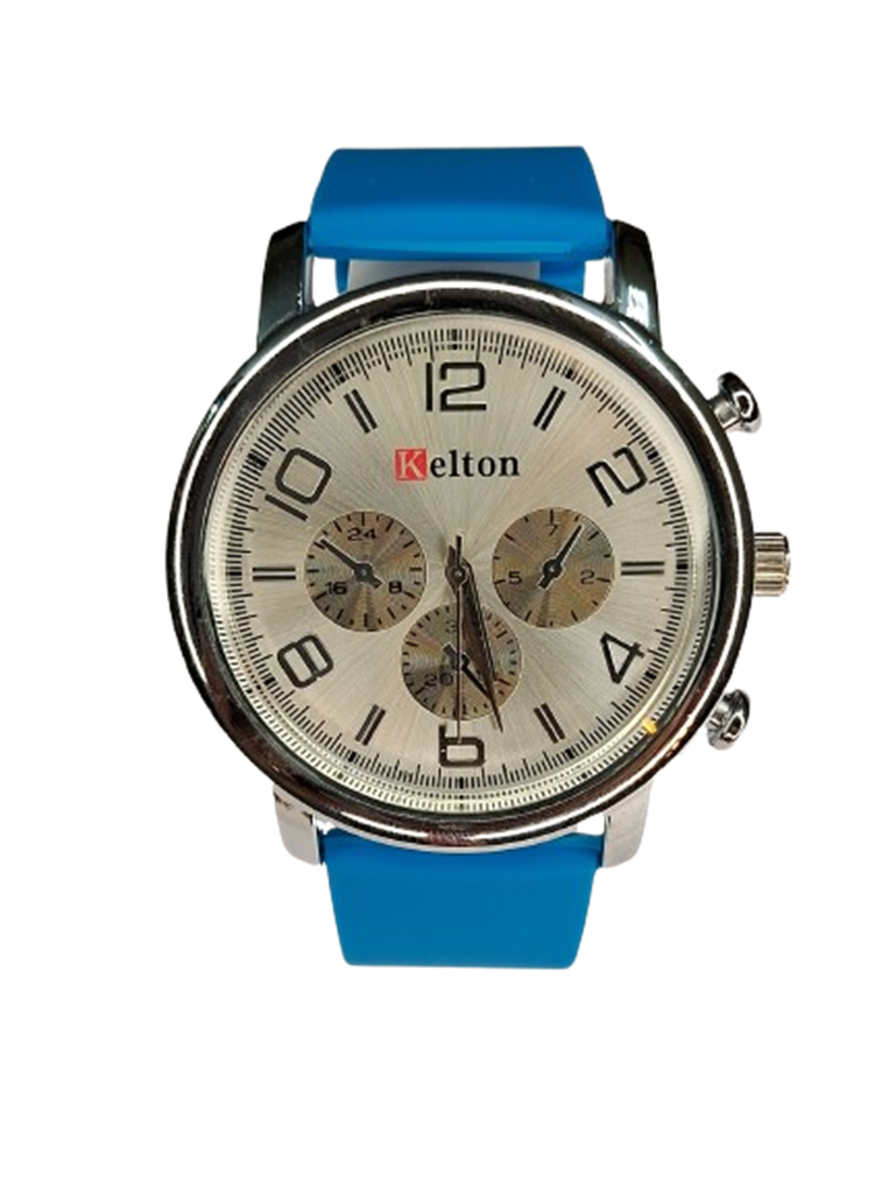 Neutral rubber blue strap and silver case complement any outfit.
