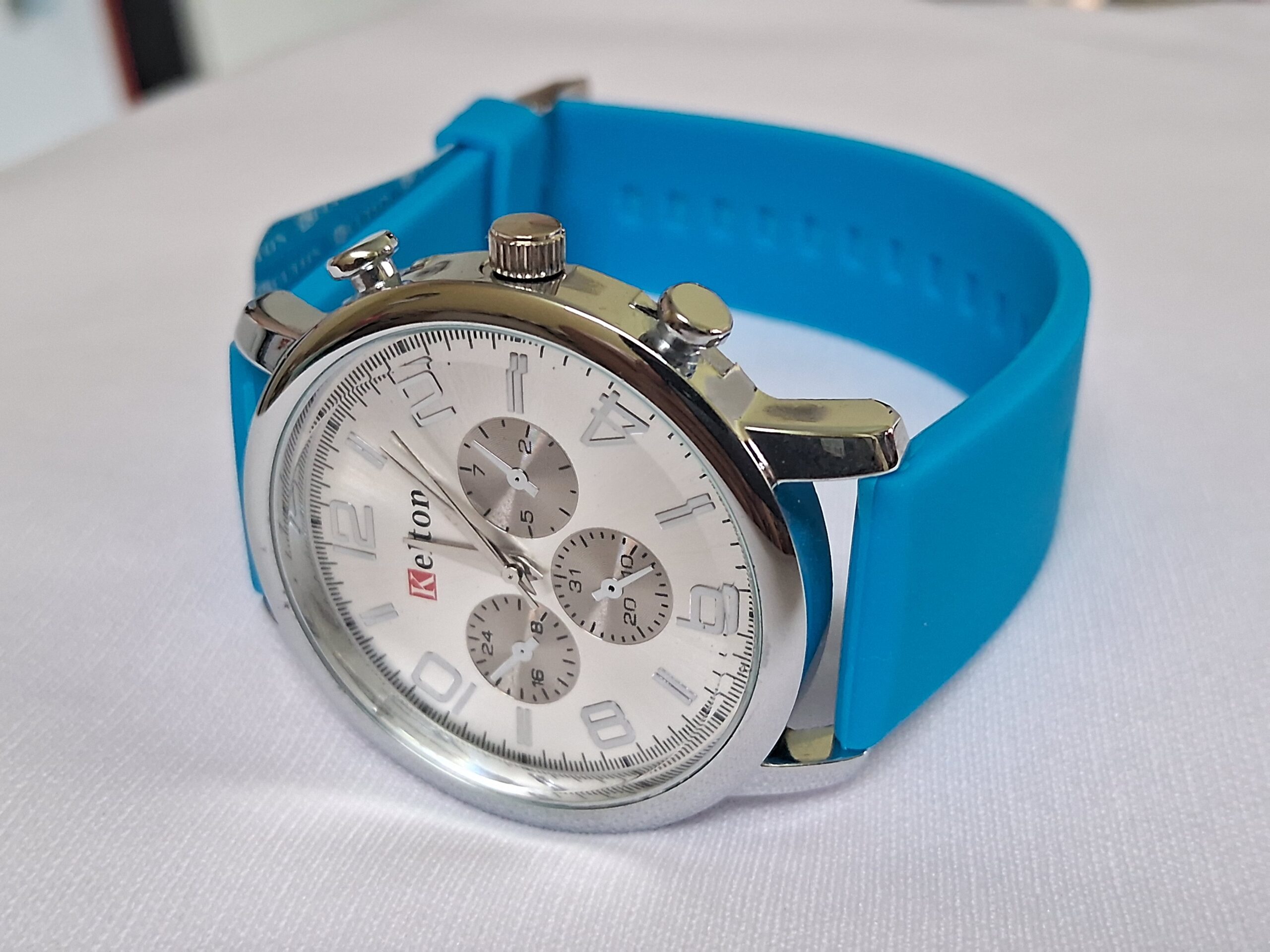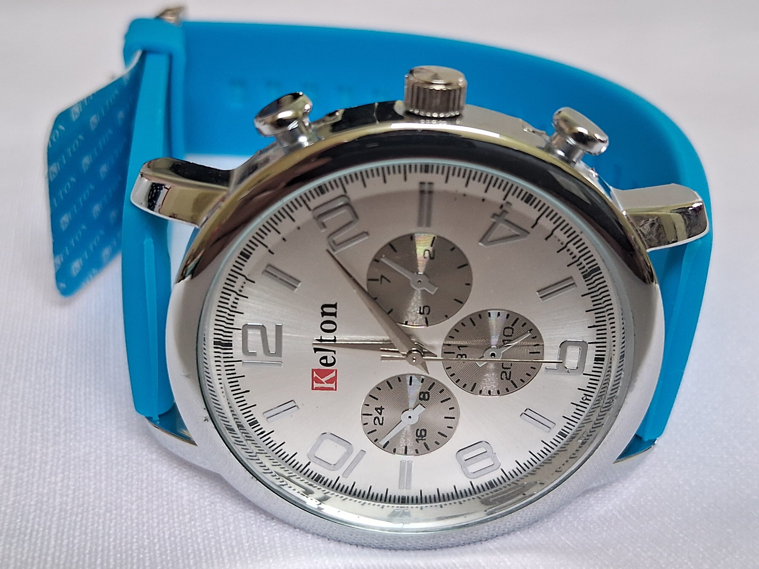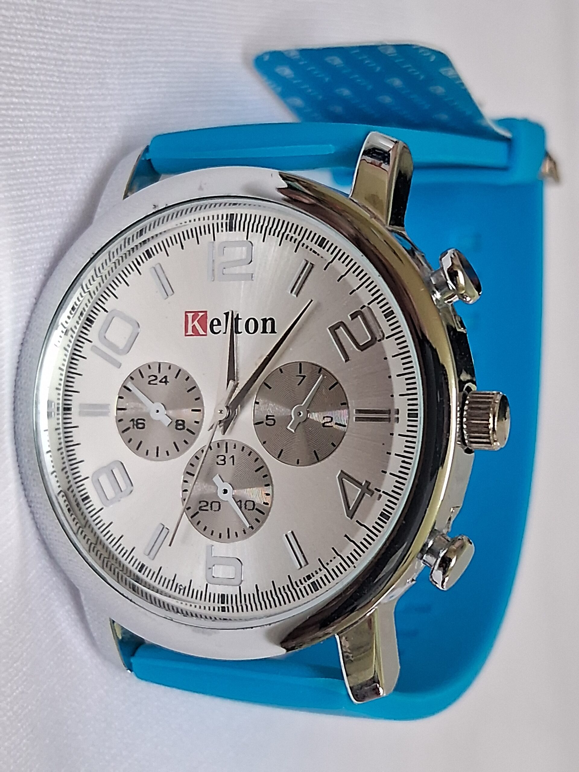 Neutral rubber blue strap and silver case complement any outfit.