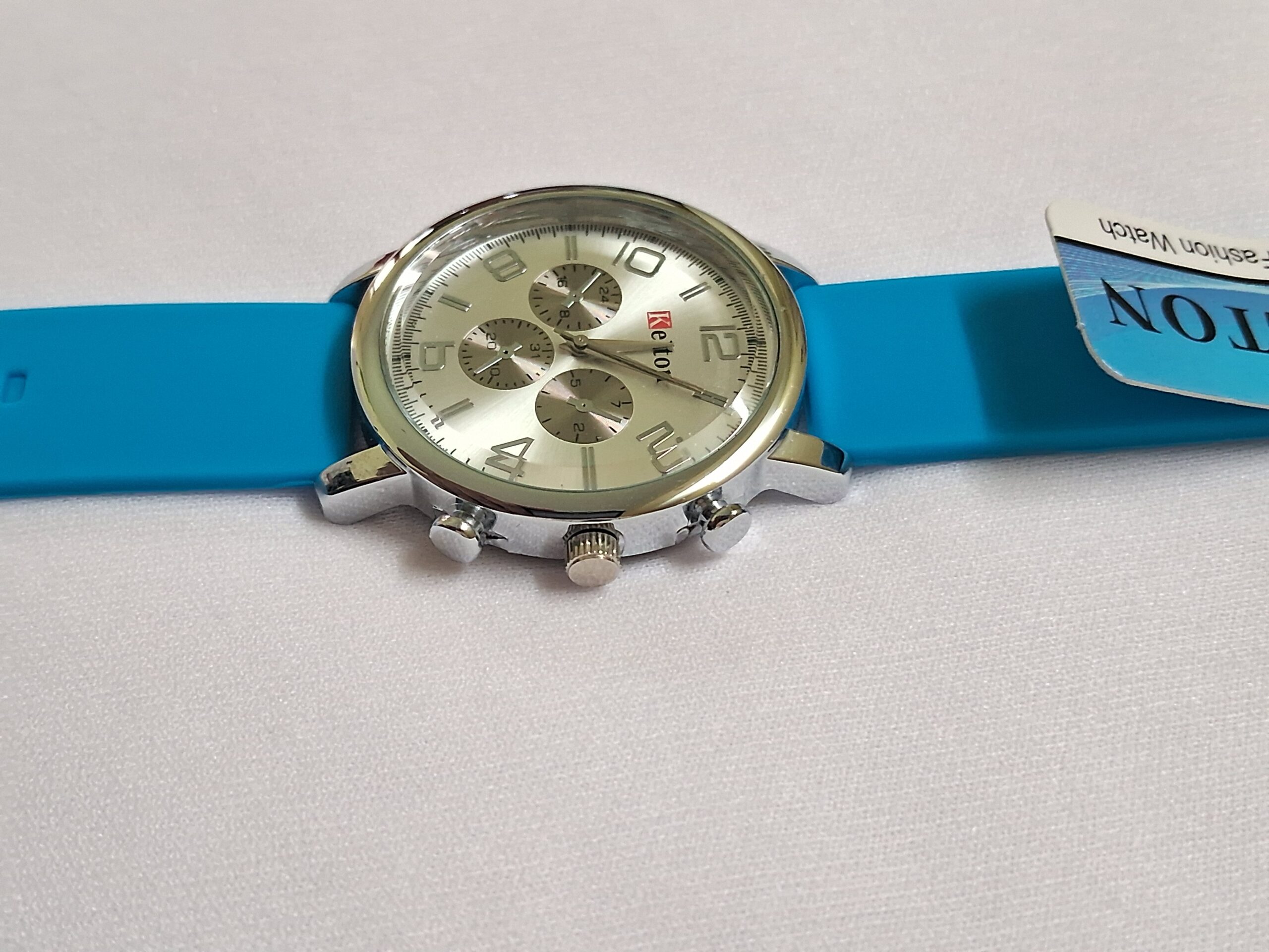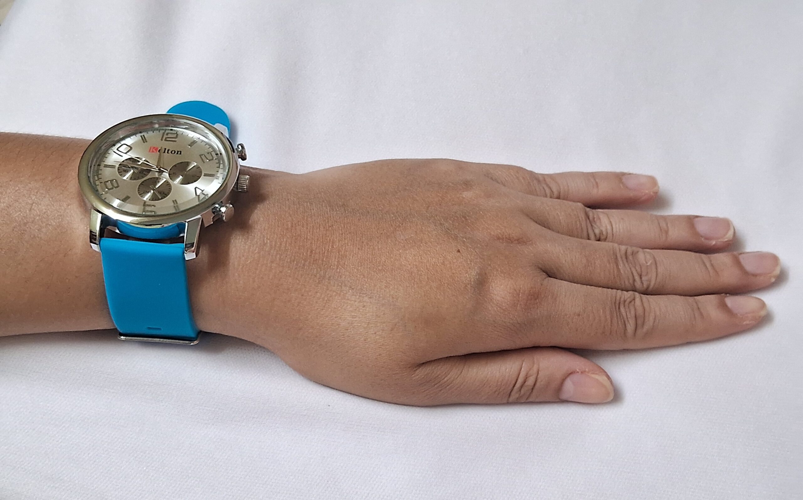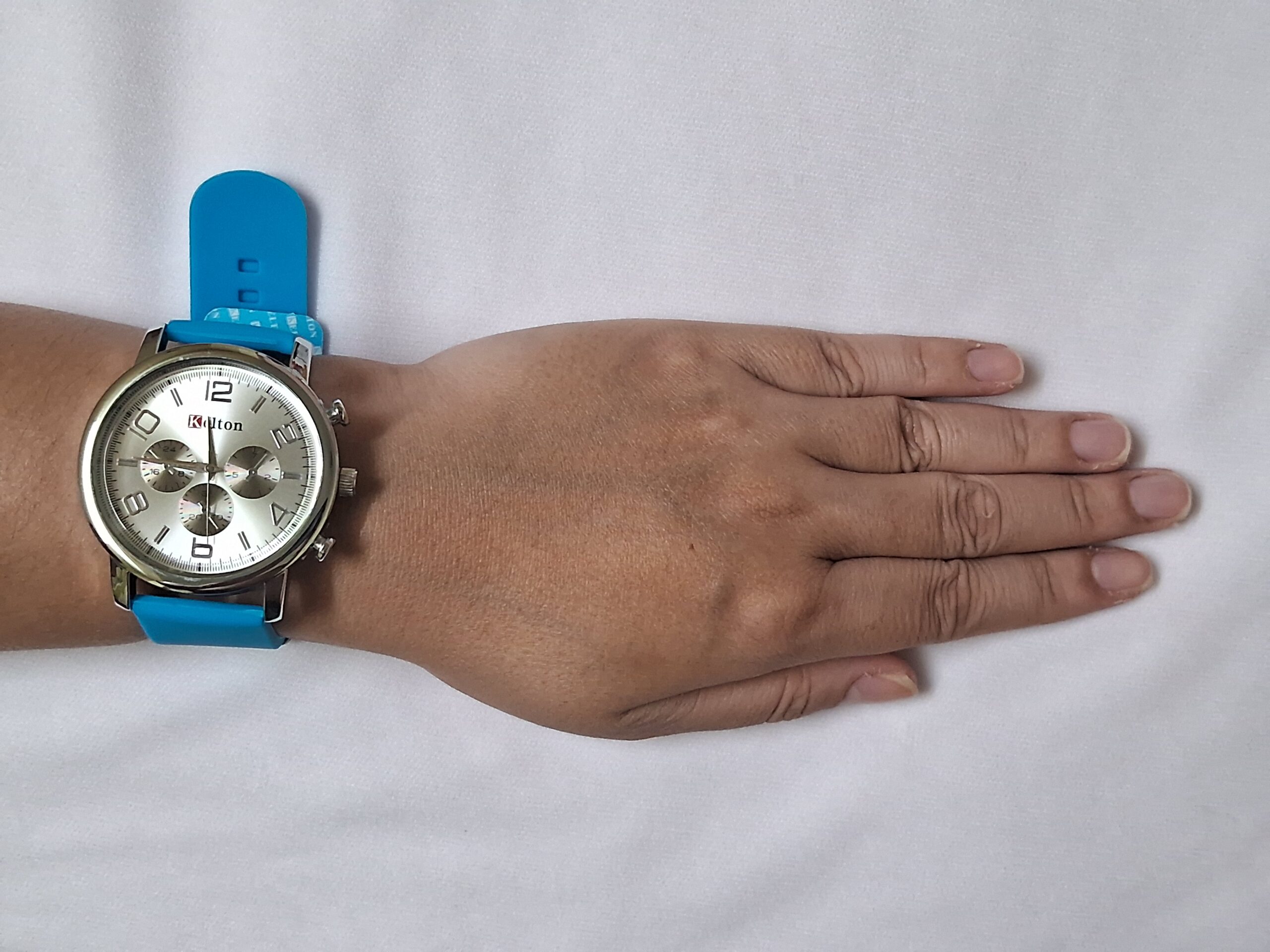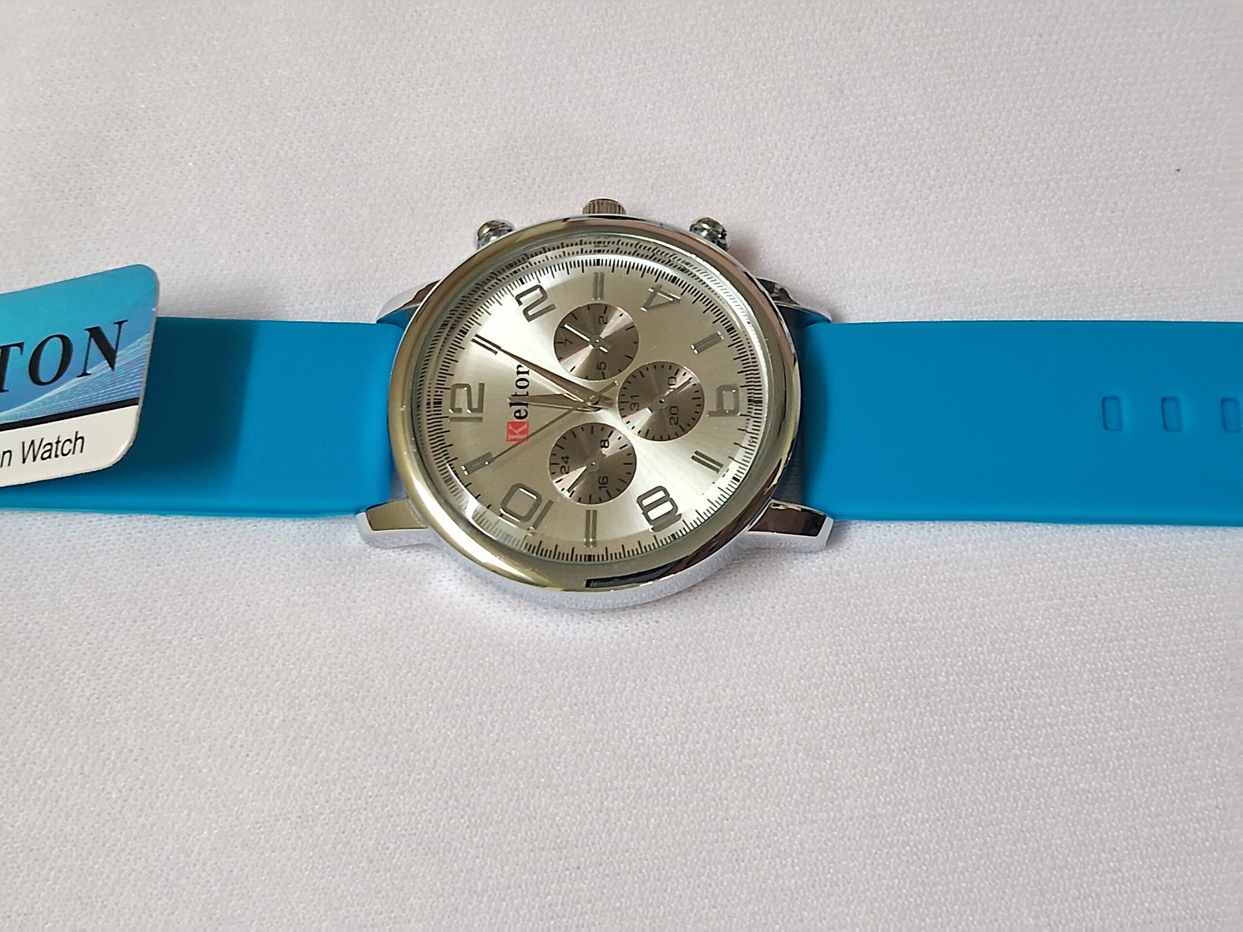 Neutral rubber blue strap and silver case complement any outfit.