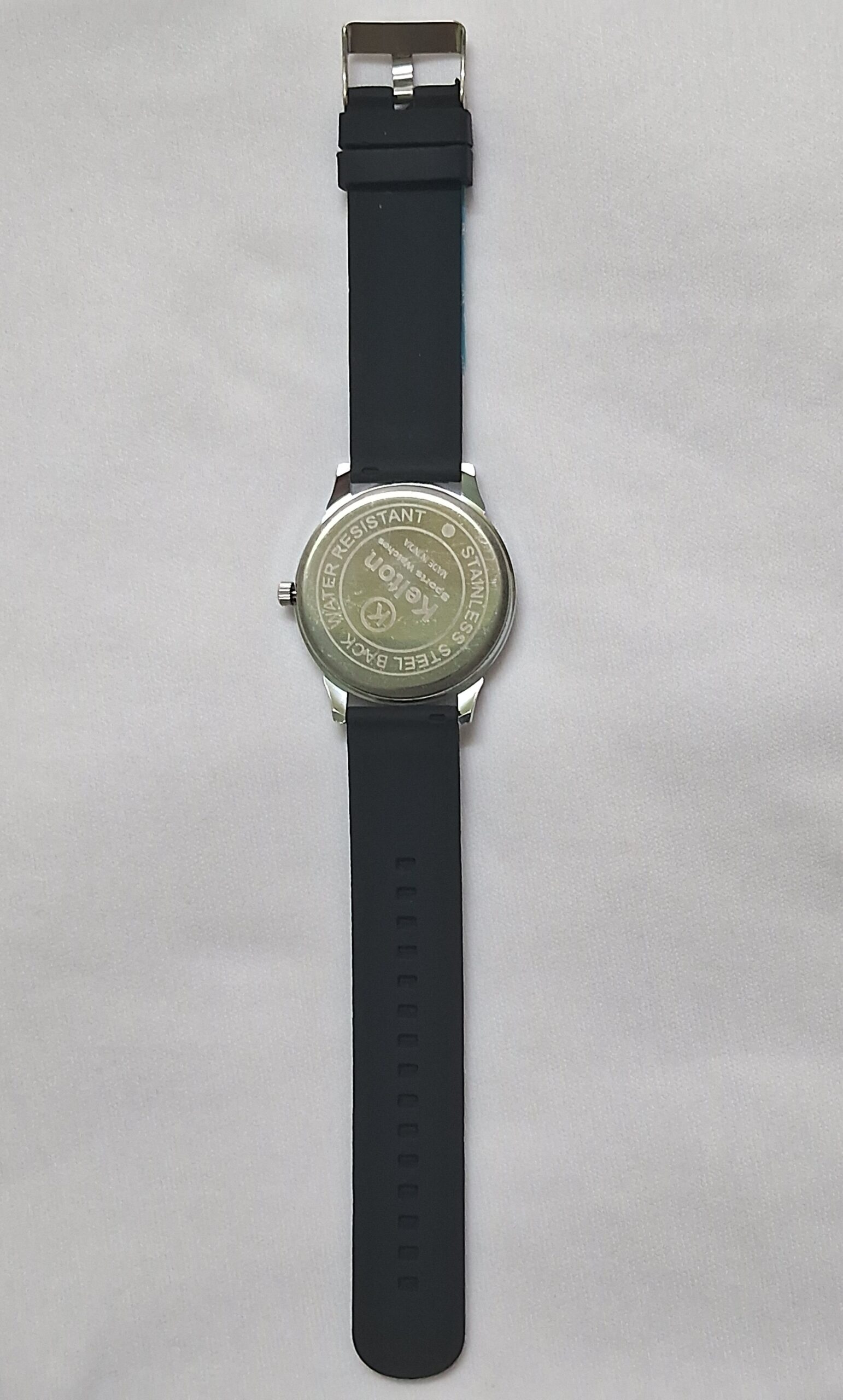 Neutral rubber black strap and silver case complement any outfit.