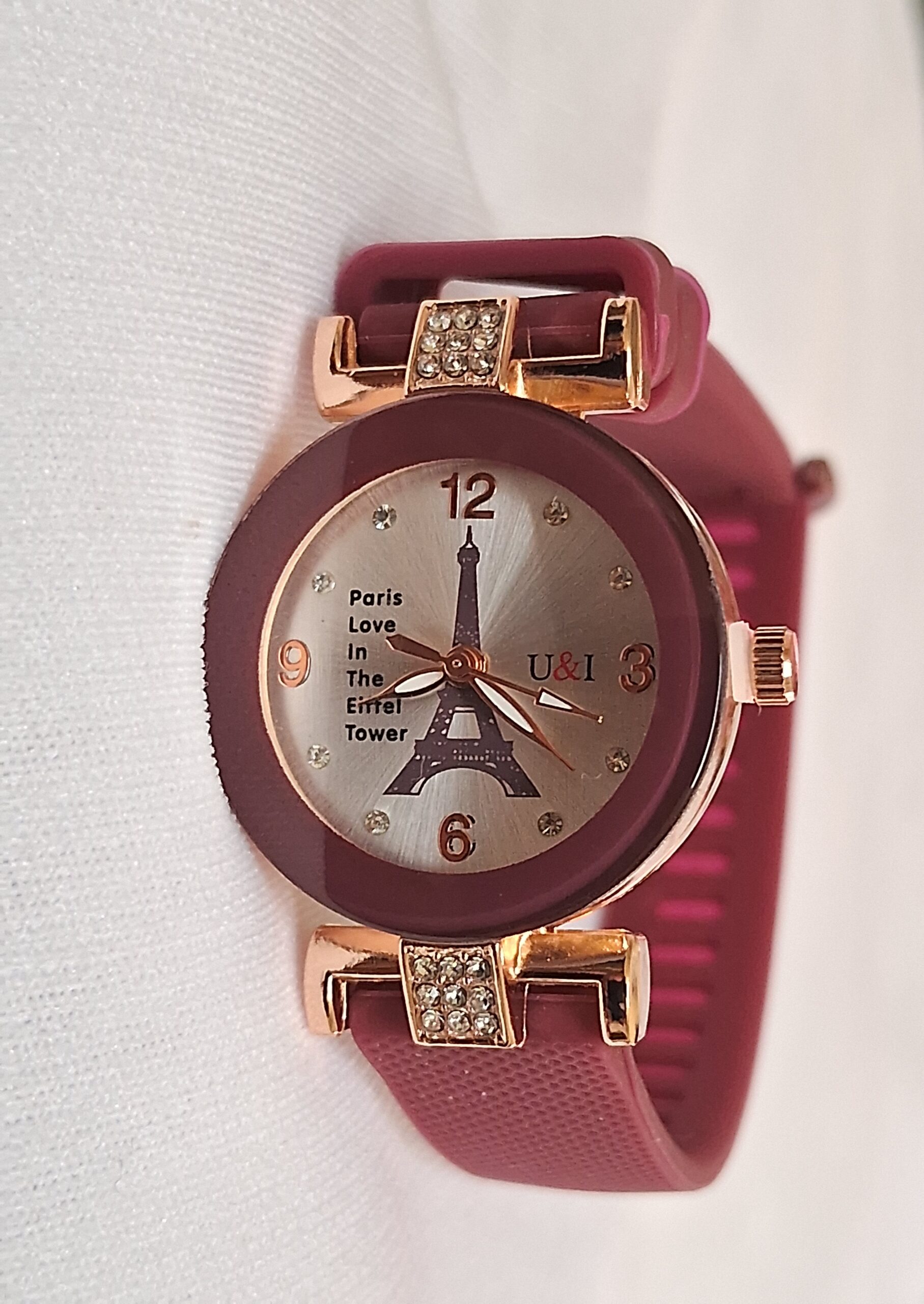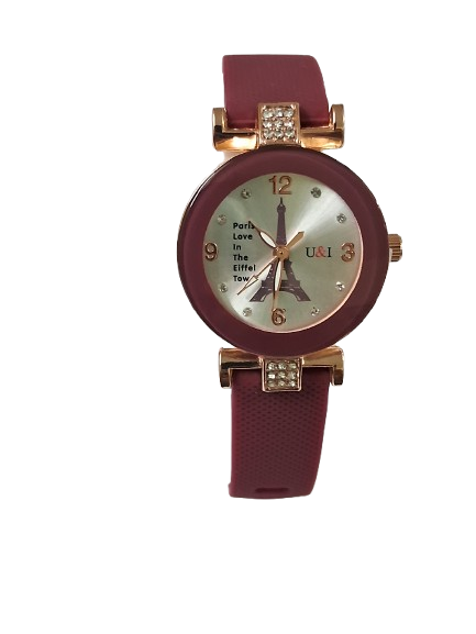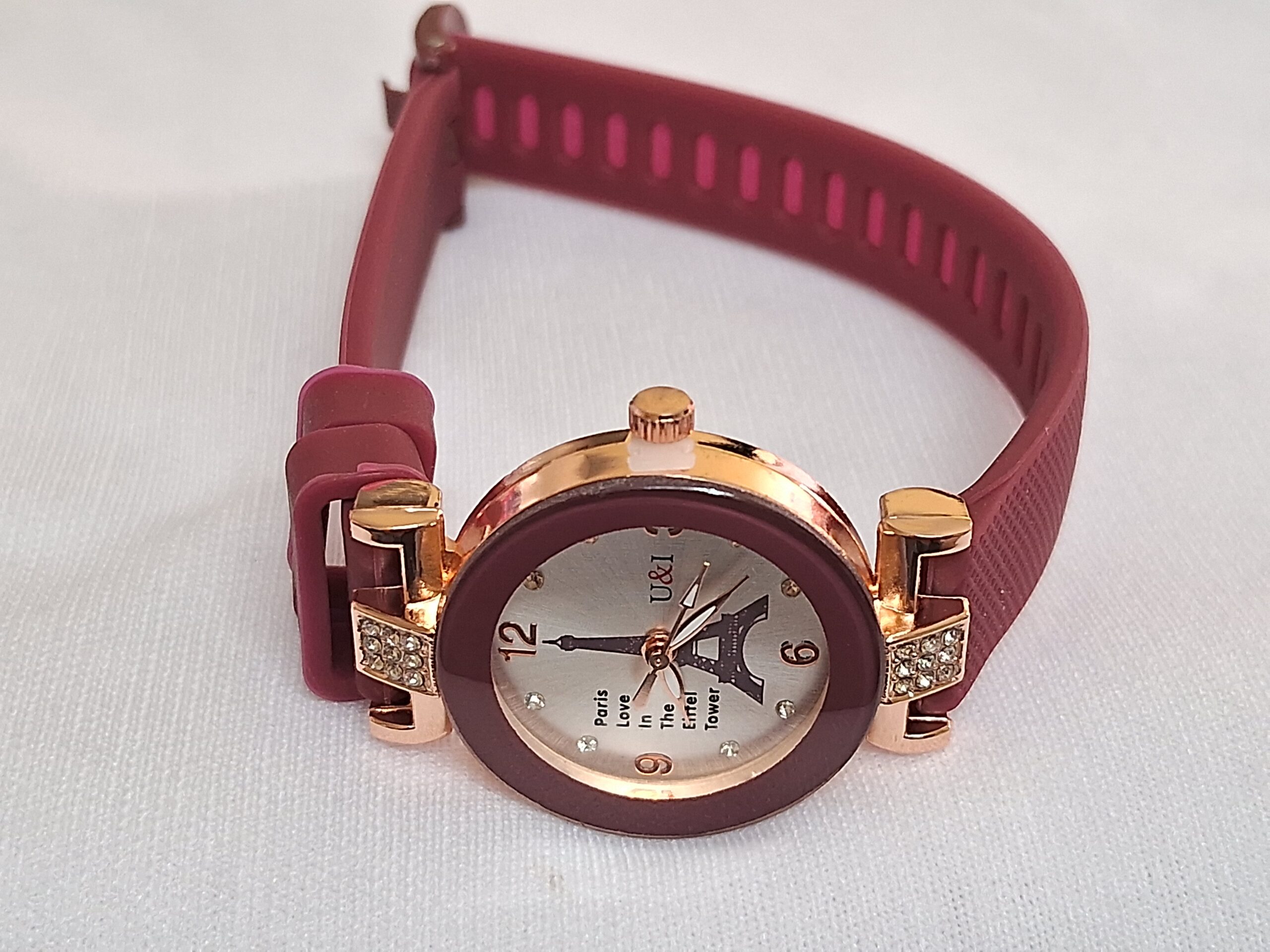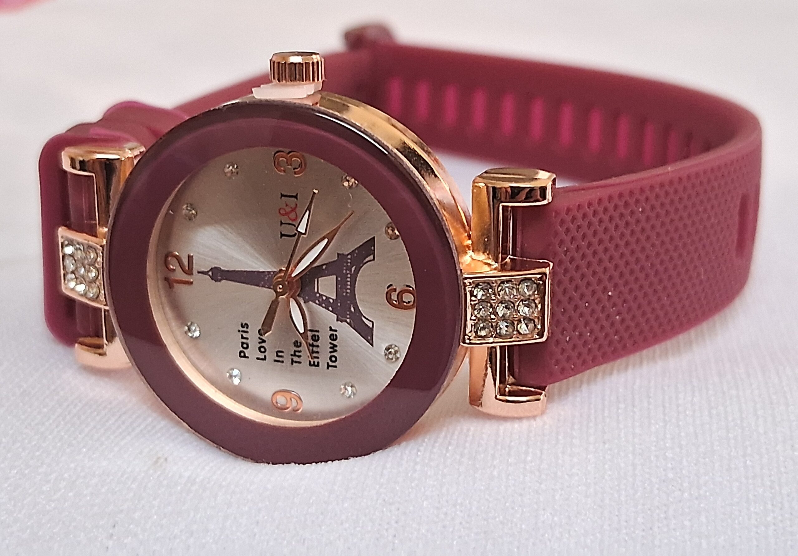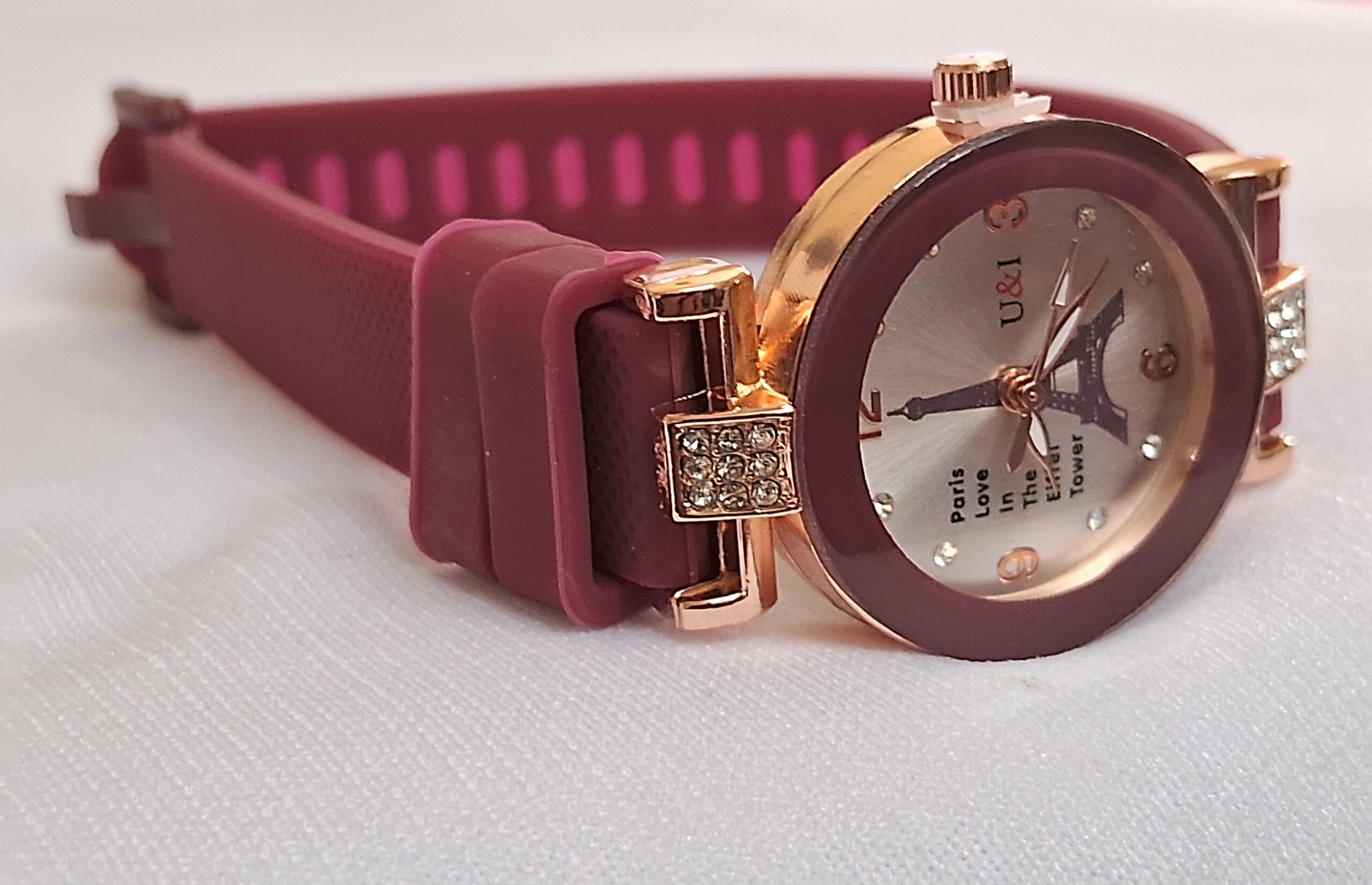 Product Title – Analog Wrist Watch for Women and Girls | Round Silver Dial Maroon Rubber Strap White Stones Fit