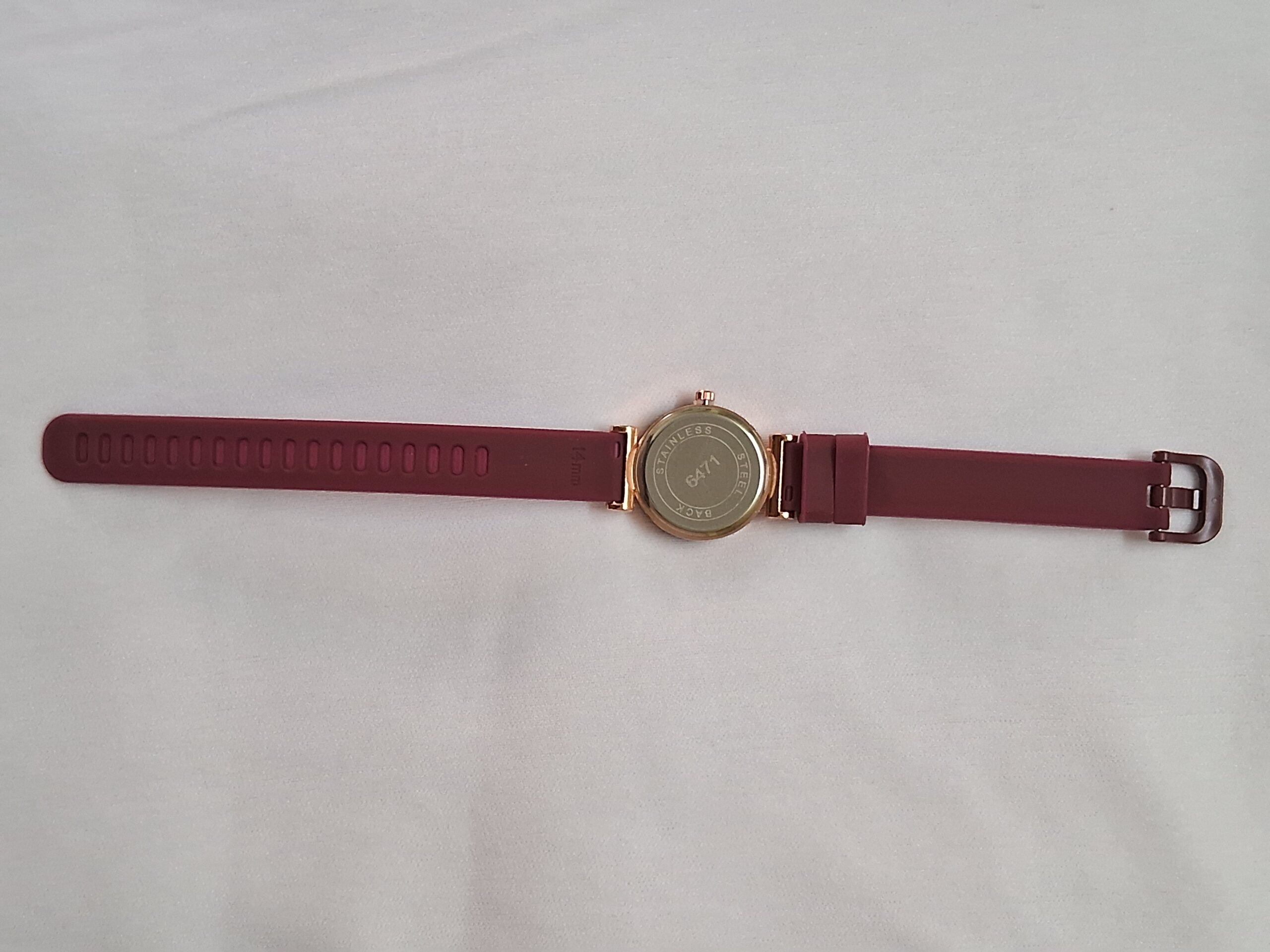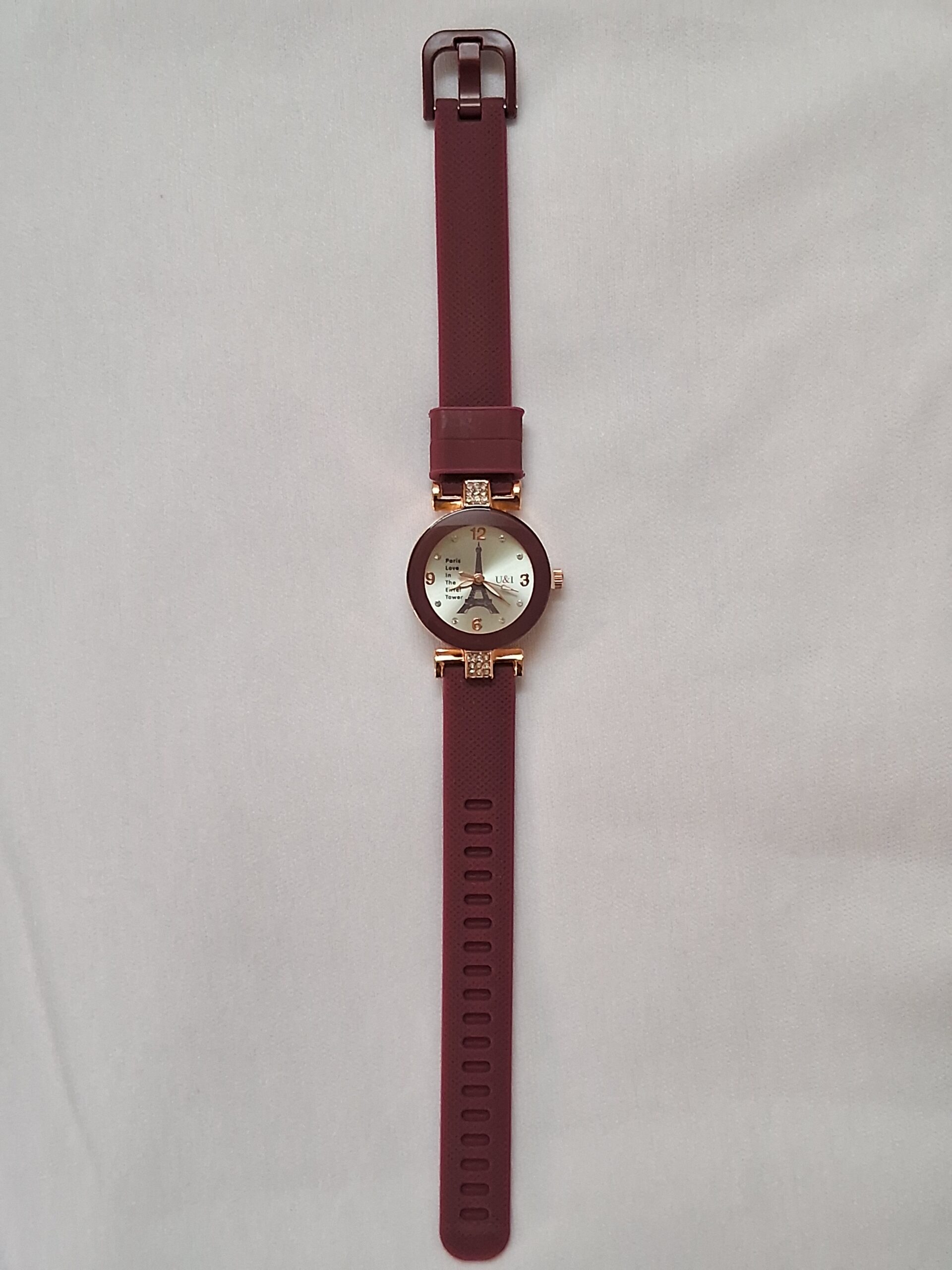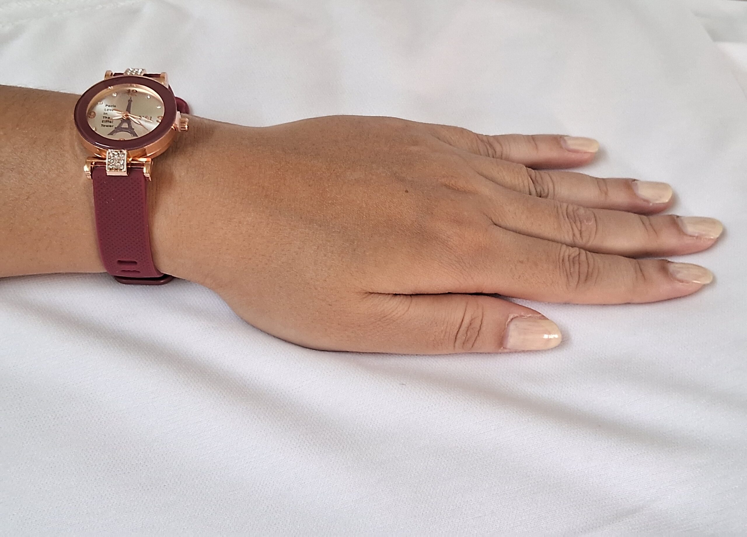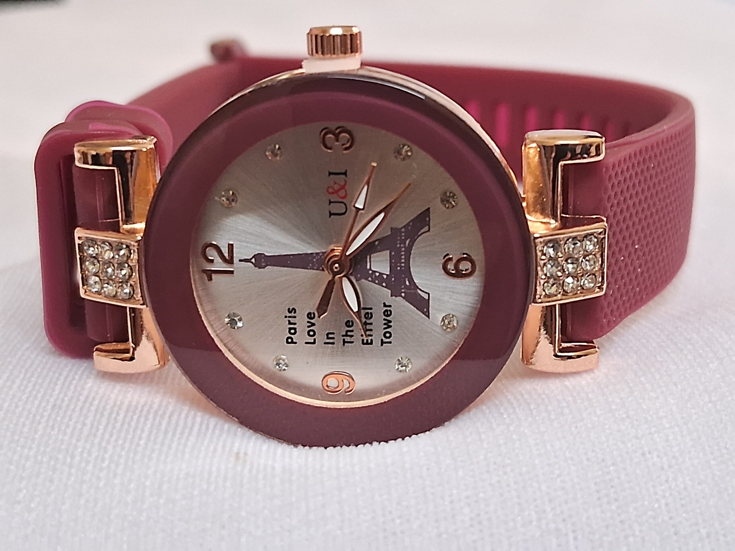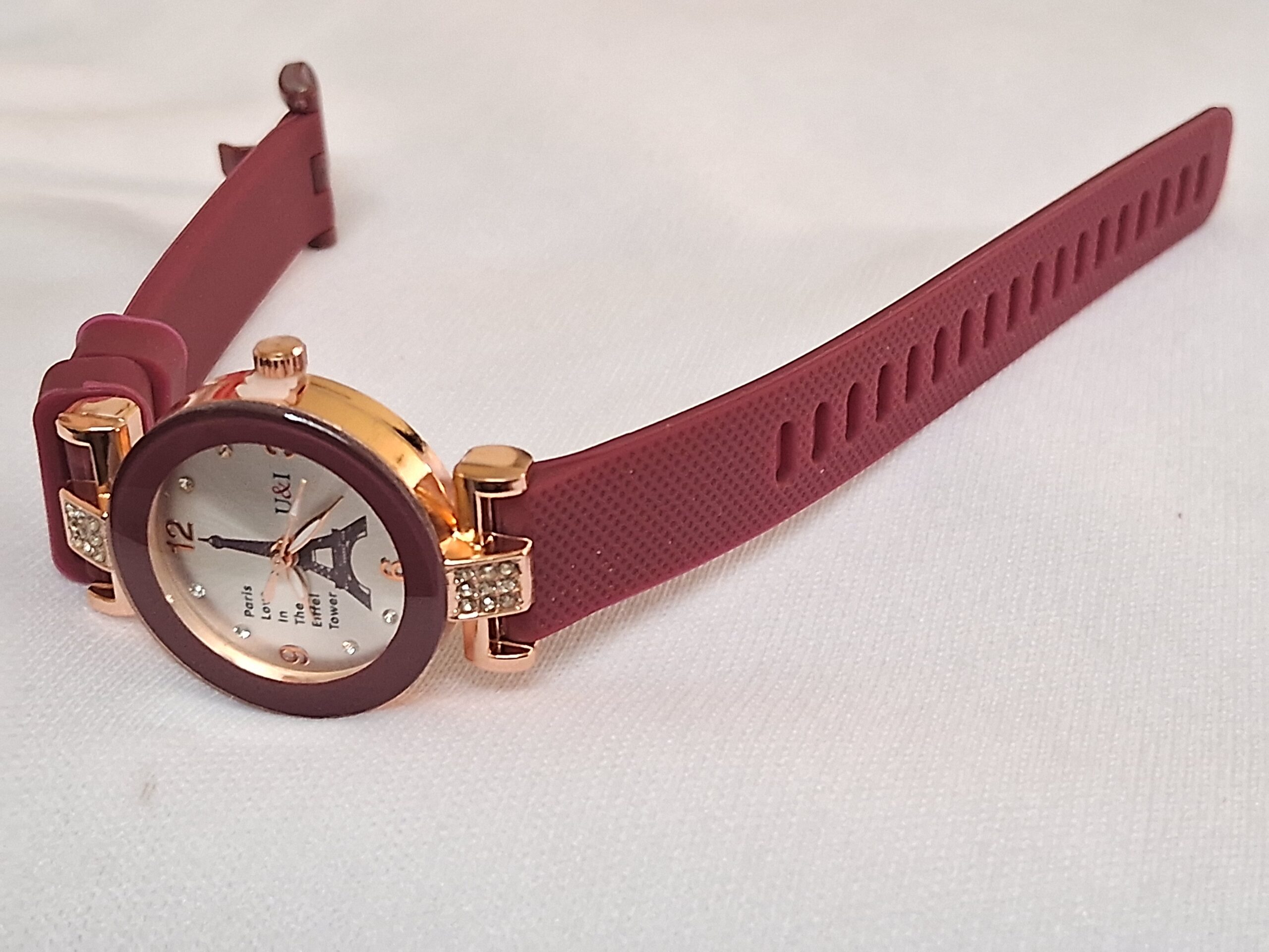 Product Title – Analog Wrist Watch for Women and Girls | Round Silver Dial Maroon Rubber Strap White Stones Fit