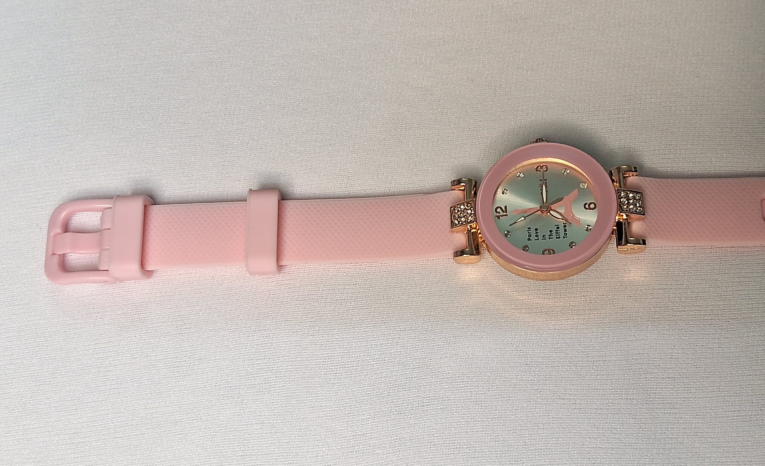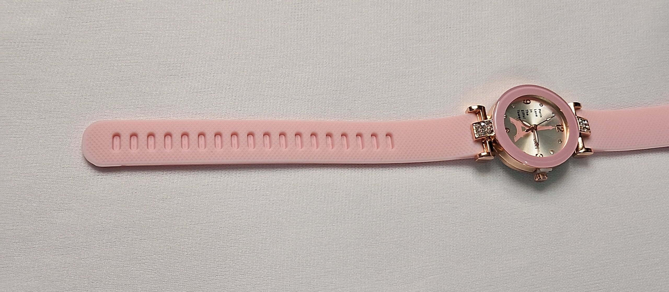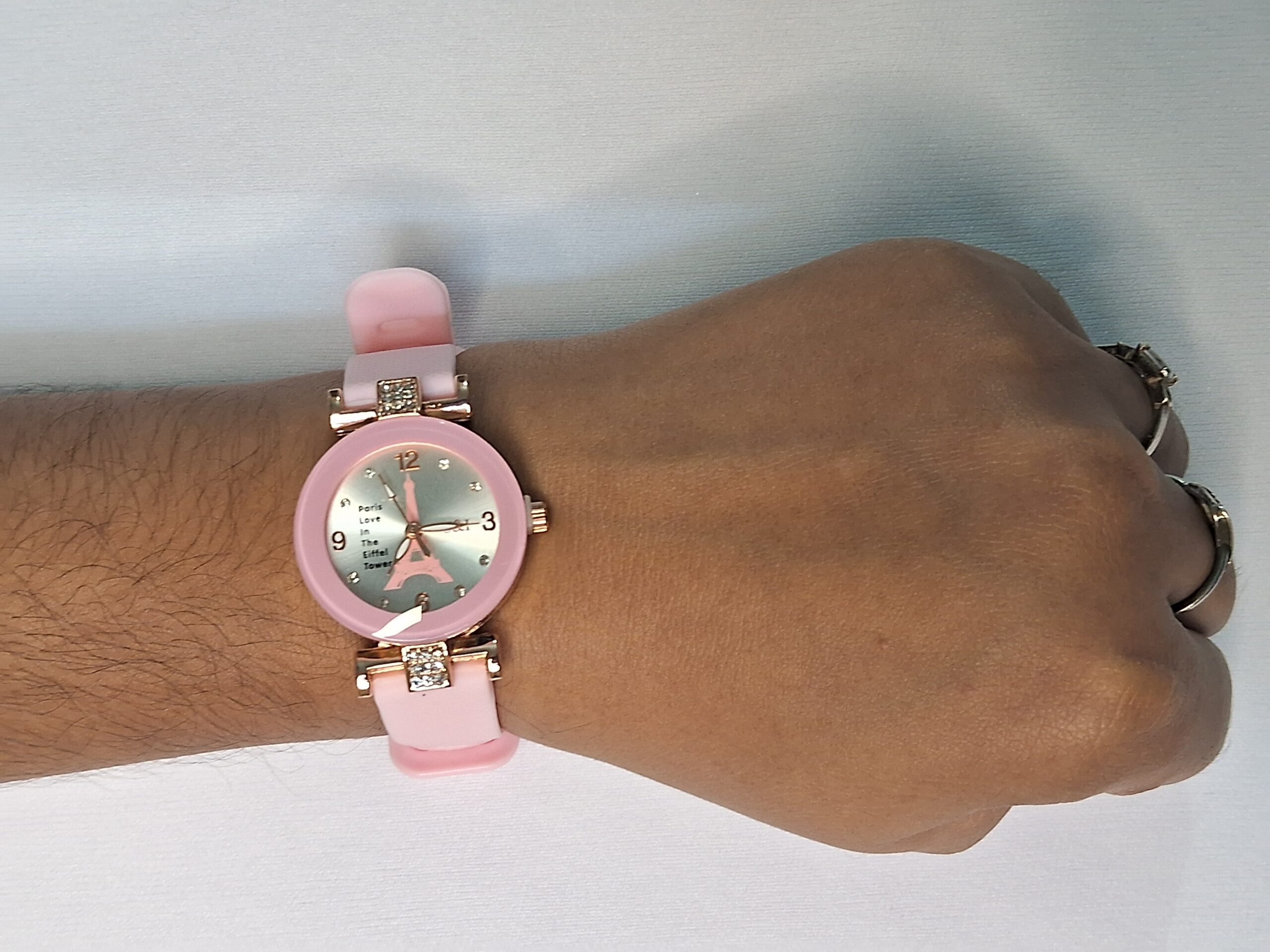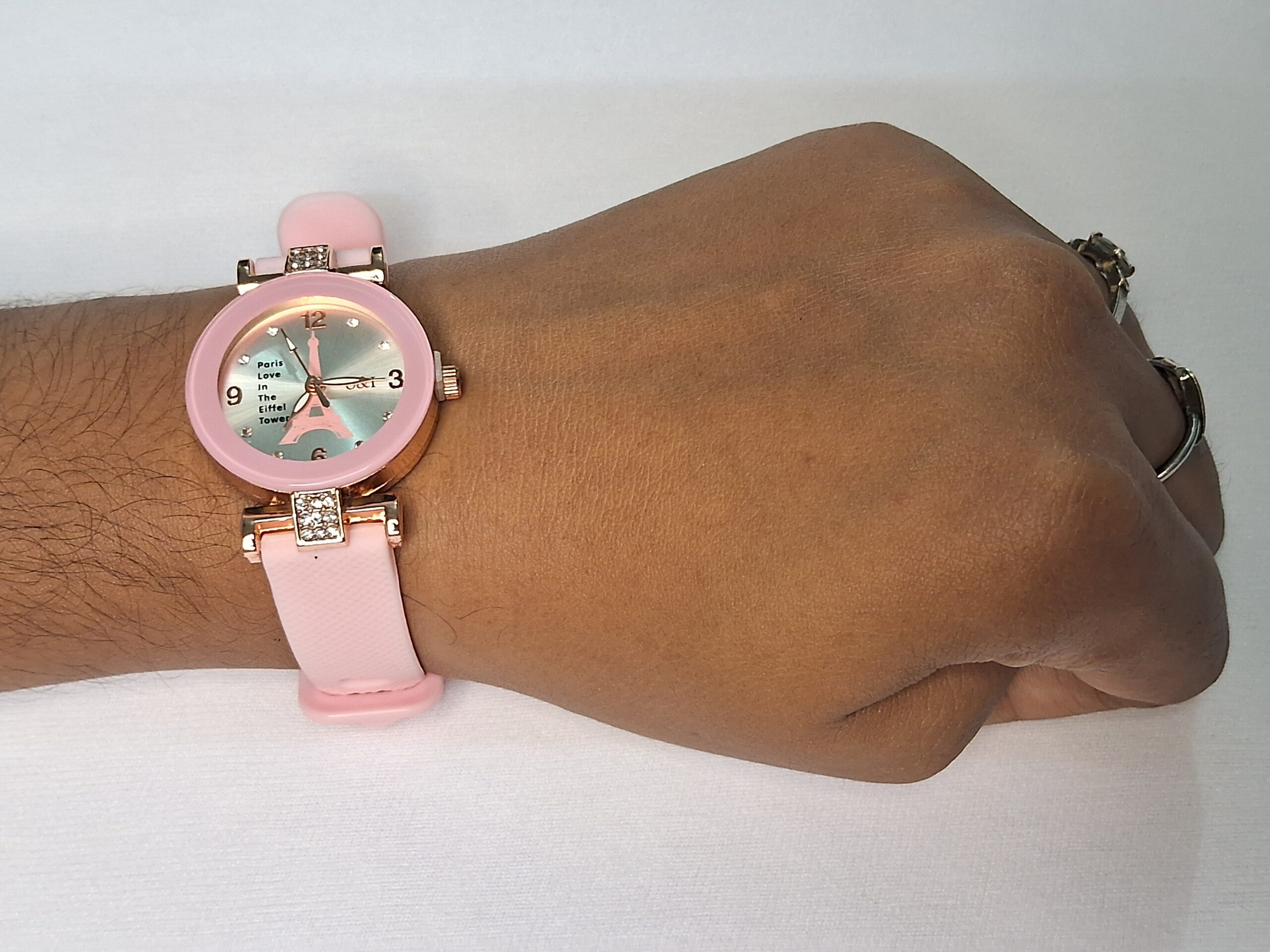 Product Title – Analog Wrist Watch for Women and Girls | Round Golden Silver Pink Dial Pink Rubber Strap White Stones Fit