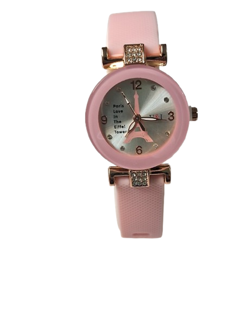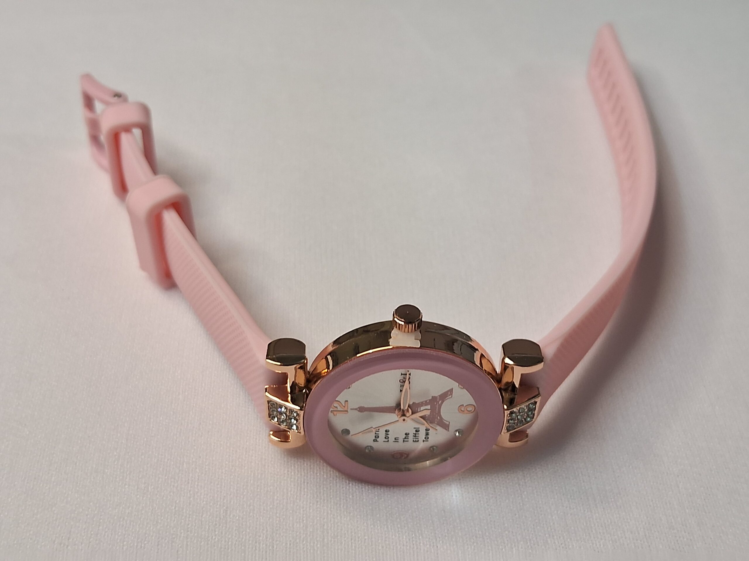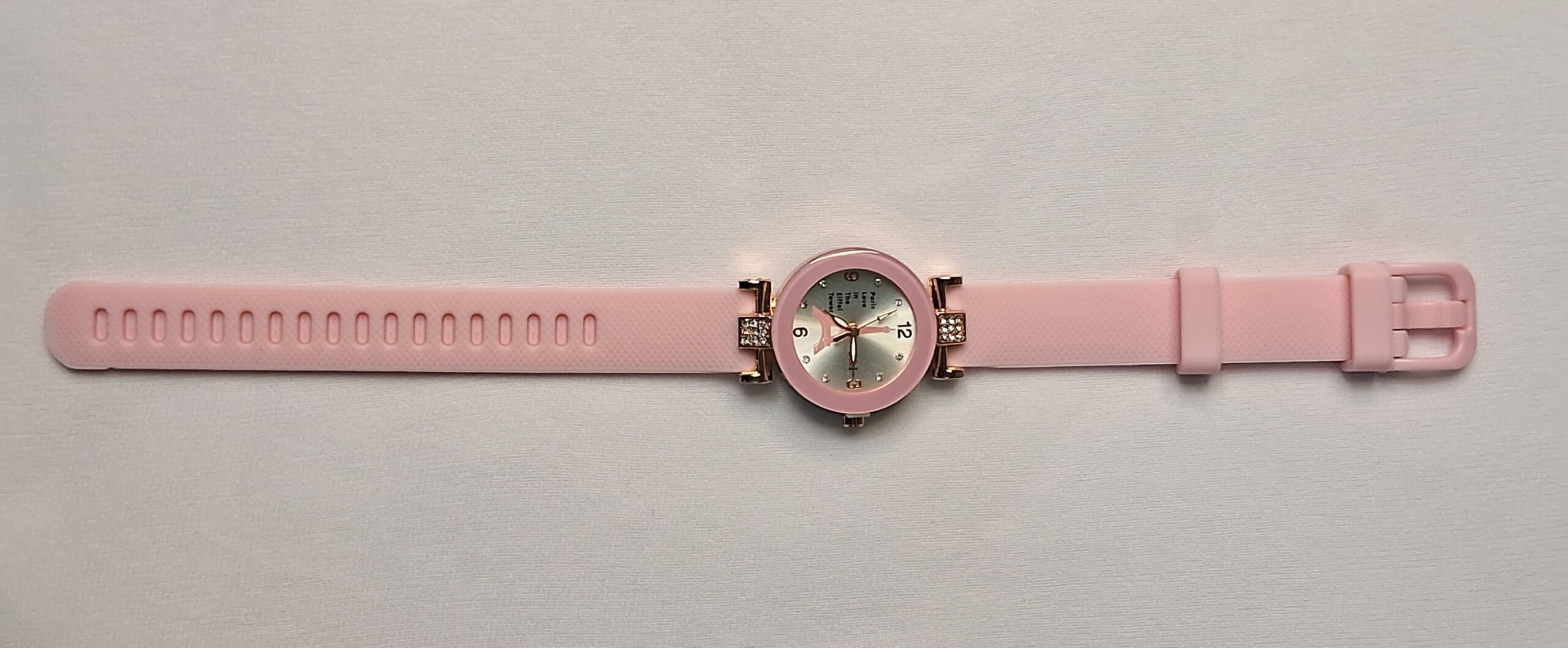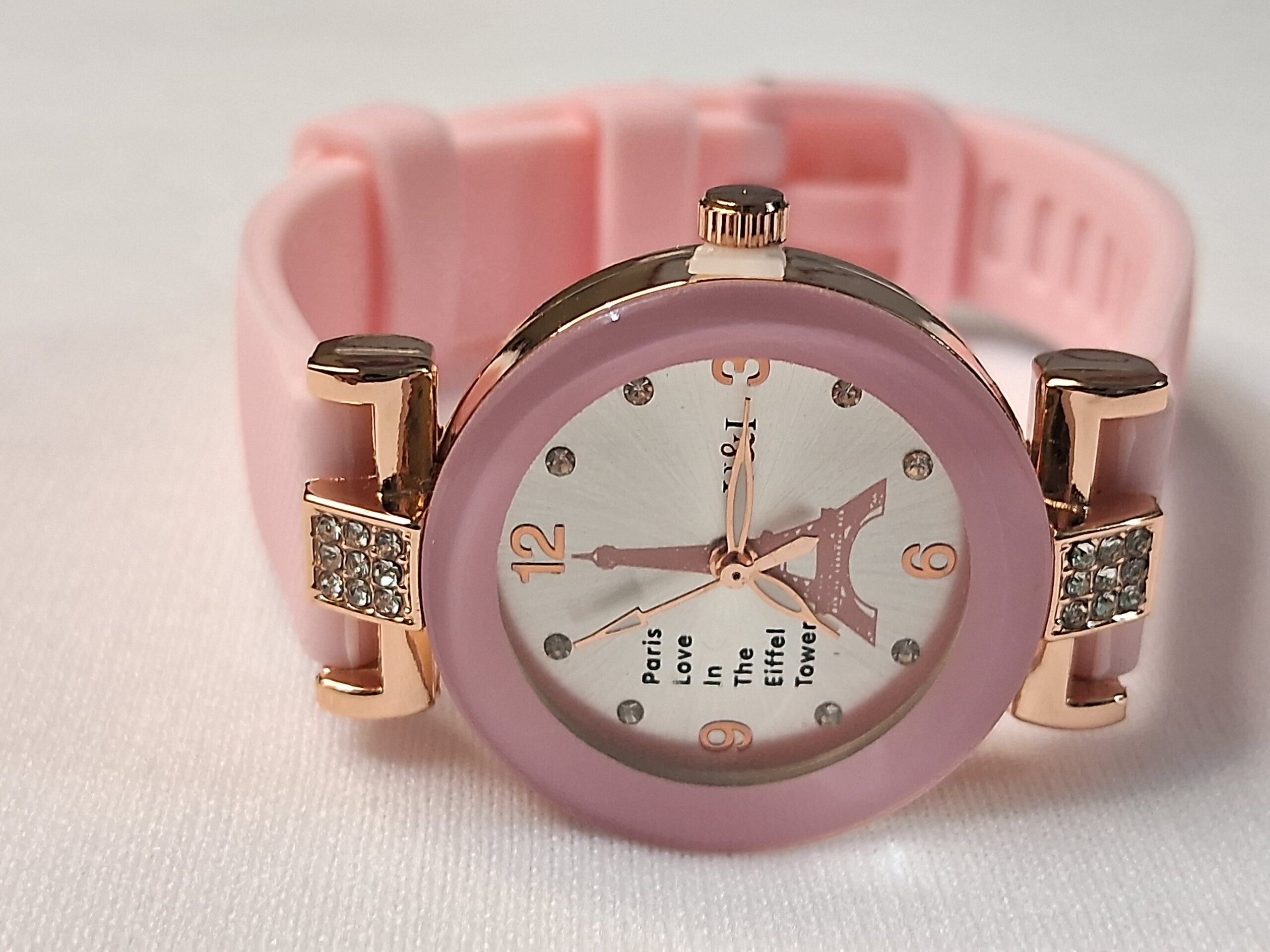 Product Title – Analog Wrist Watch for Women and Girls | Round Golden Silver Pink Dial Pink Rubber Strap White Stones Fit